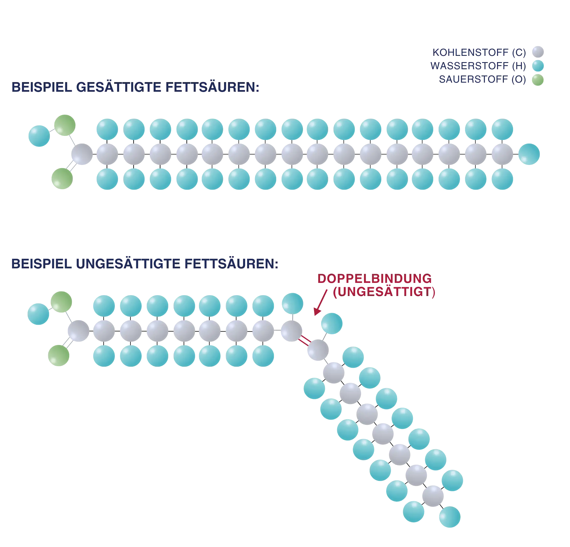 Fettsäuren sind organische Säuren und Bausteine von Fetten und Ölen. Sie bestehen aus Kohlenstoff(C)- und Wasserstoffatomen(H) und werden in zwei Hauptgruppen unterteilt: gesättigte und ungesättigte Fettsäuren. Eine Fettsäure ist dann „gesättigt“, wenn jedes Kohlenstoffteilchen zwei Wasserstoffteilchen an sich gebunden hat. Fehlt an einer Stelle das Wasserstoffteilchen, ist die Fettsäure „ungesättigt“. Je nachdem, an wie vielen Stellen Wasserstoffteilchen fehlen, ist die Fettsäure einfach oder mehrfach ungesättigt. An der Stelle, wo Wasserstoffteilchen fehlen, sind die C-Atome durch Doppelbindungen verknüpft.