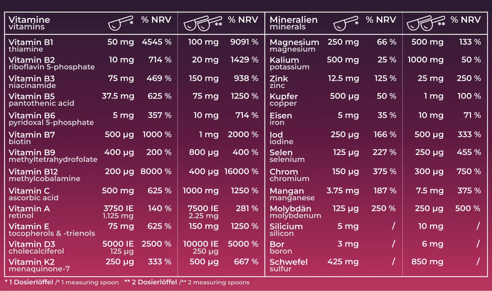 Ich muss sagen es schmeckt besser und nicht so süß wie das Multi mit stevia ! 200 ml plus 1/2 Löffel Mittag und Abend! Es ist in dieser Zusammensetzung das einzigste Multi in Pulver Form auf dem Markt ! Verfolge SFH seit Anfang an !