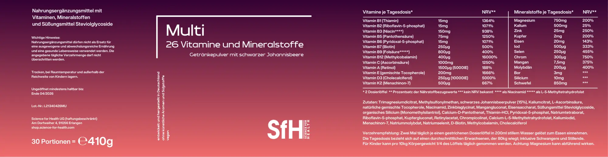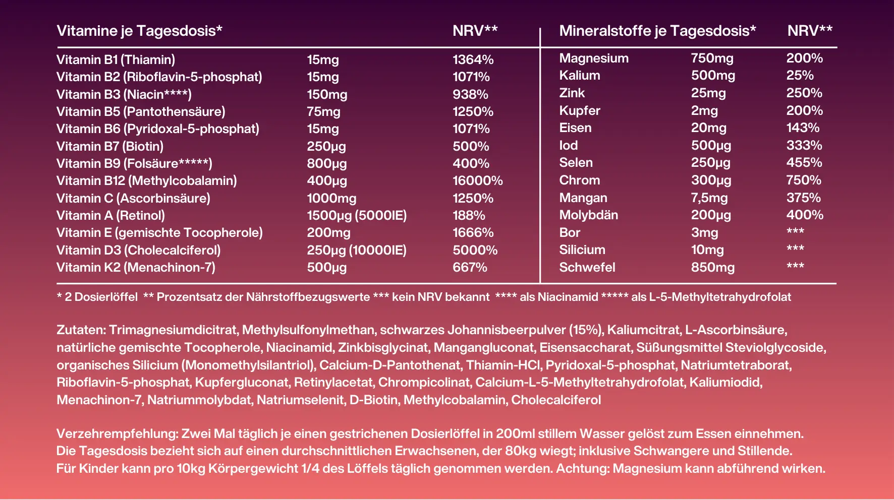 Nachdem ich viele Jahre lang alle Supplements einzeln genommen habe, um meine gewünscht hohen Dosierungen zu erreichen, ist das Mulit für mich ein absoluter Gamechanger! Ich habe es mit anderen Produkten verglichen, die auch eine Vielzahl an Inhaltsstoffen haben: Multi hat ein unschlagbares Preis-Leistungs-Verhältnis. Ich nehme jeden Tag 2 x einen dreiviertel Messlöffel voll mit einem Schluck Wasser zu einer Mahlzeit und bin versorgt (zumindest sagen das meine Bluttests :)). Möchte nicht mehr ohne sein – Danke für dieses tolle Produkt!