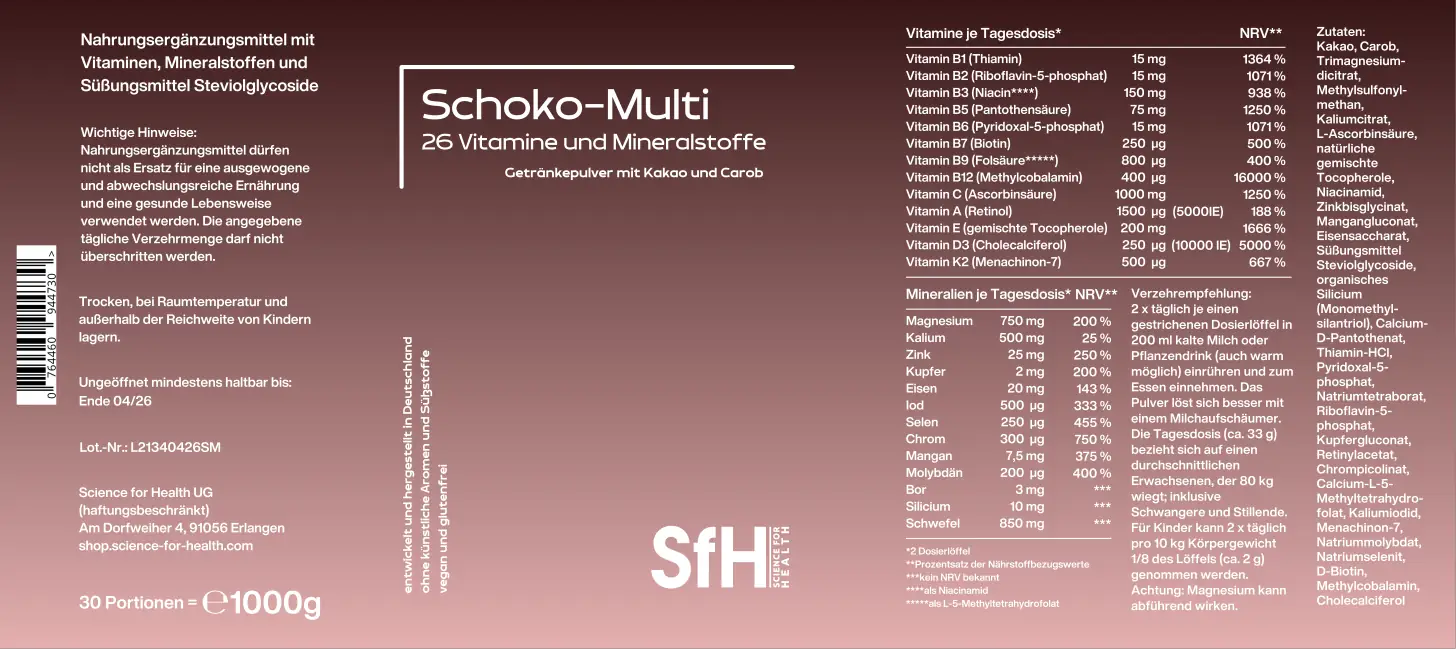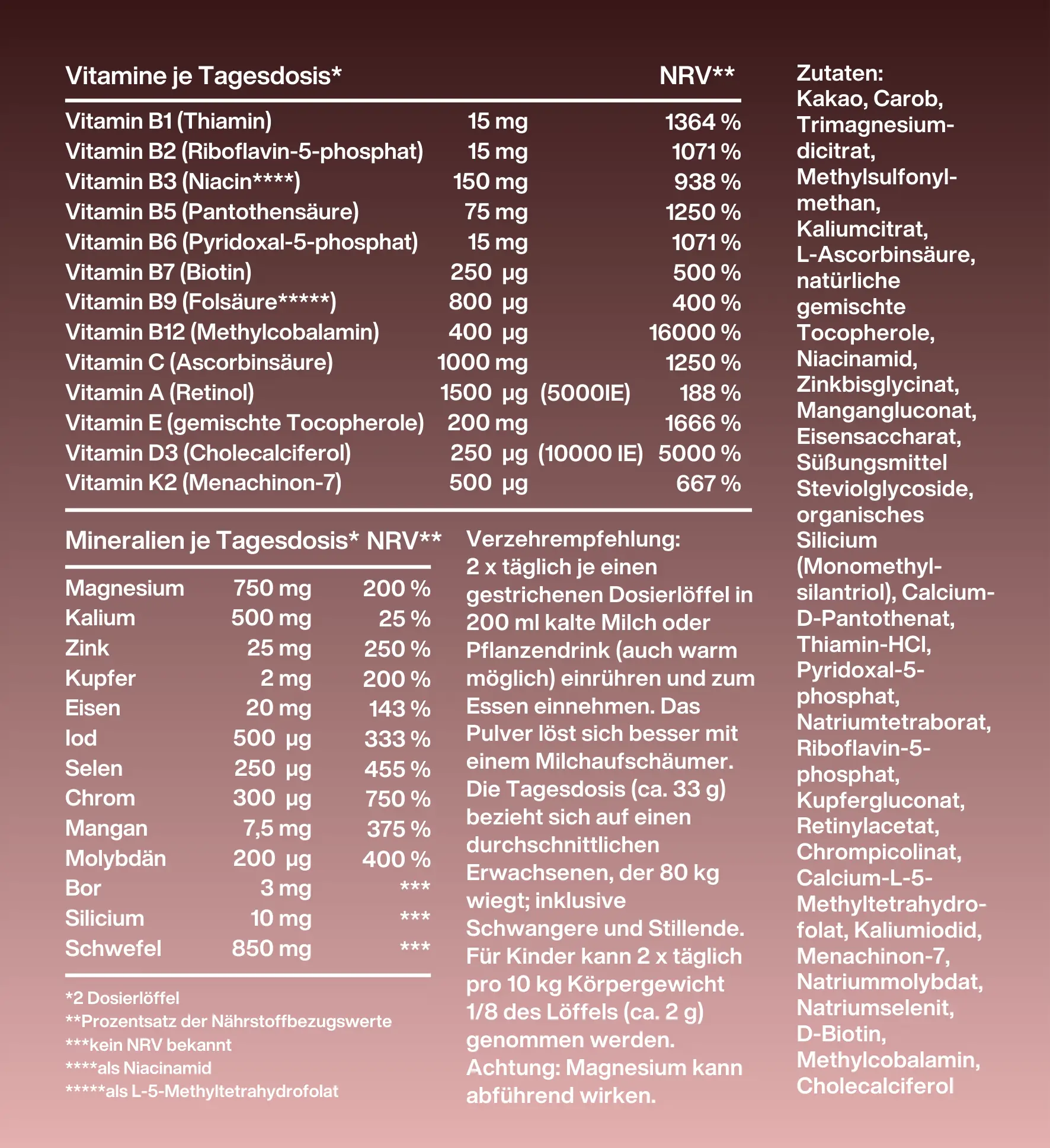 Nahrungsergänzungsmittel mit Vitaminen, Mineralstoffen, Kakao und Carob – für die ganze Familie