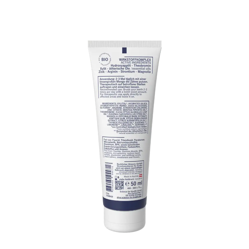 Was diese Zahncreme so besonders macht, ist die Kombination aus seltenen und hochwirksamen Spurenelementen wie Strontiumchlorid, Arginin, Theobromin und Hydroxyapatit – Inhaltsstoffe, die man in der Form sonst fast nirgends findet.
