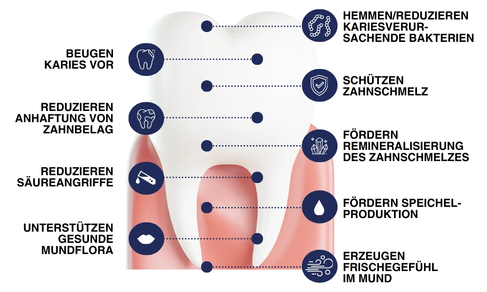 neutralisieren Säuren, regulieren den oralen pH-Wert und fördern die Remineralisation des Zahnschmelzes
